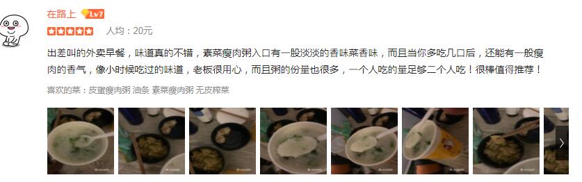 粥店良心老板,份量真的超赞点了两份,我和我朋友一人一份,我吃的南瓜粥,真的超好吃,甜甜的,熬得很稠,很好吃!份量太多了,我和我朋友两个人吃一份就够了,所以下次我打算点一份两个人一起吃。点了一份凉面也非常好吃,如果在加点醋就很完美了。点了一份榨菜,酸豇豆,脆脆的,酸度刚刚合适,配粥品绝了必须推荐!