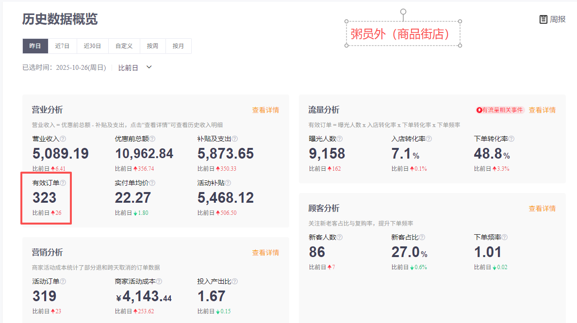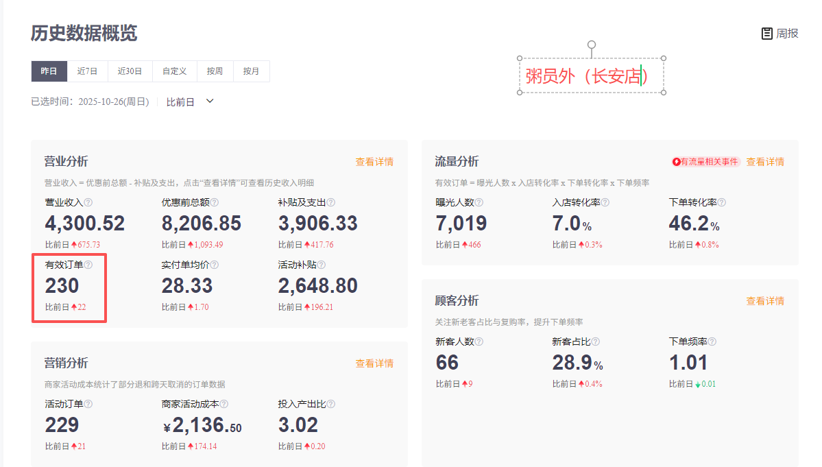 粥员外·双店同日战绩-周日美团单平台订单323单 vs 230单